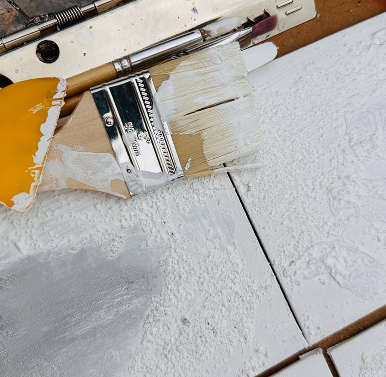 Back in the studio, I began experimenting with colour and texture to translate those impressions into paint. Deep indigos, stormy greys, and flashes of seafoam green became my palette. I layered paint, scraped it back, and layered again, mimicking the movement and unpredictability of the sea. The process felt as fluid as the tide itself—never static, always shifting.
